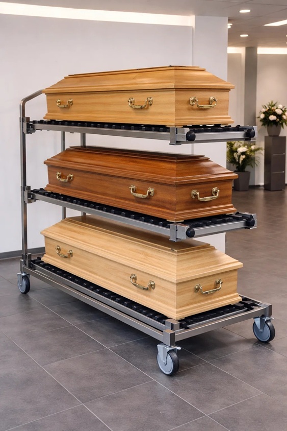 für 2 Särge • auf Rollen, 2 Rollen mit Feststeller •